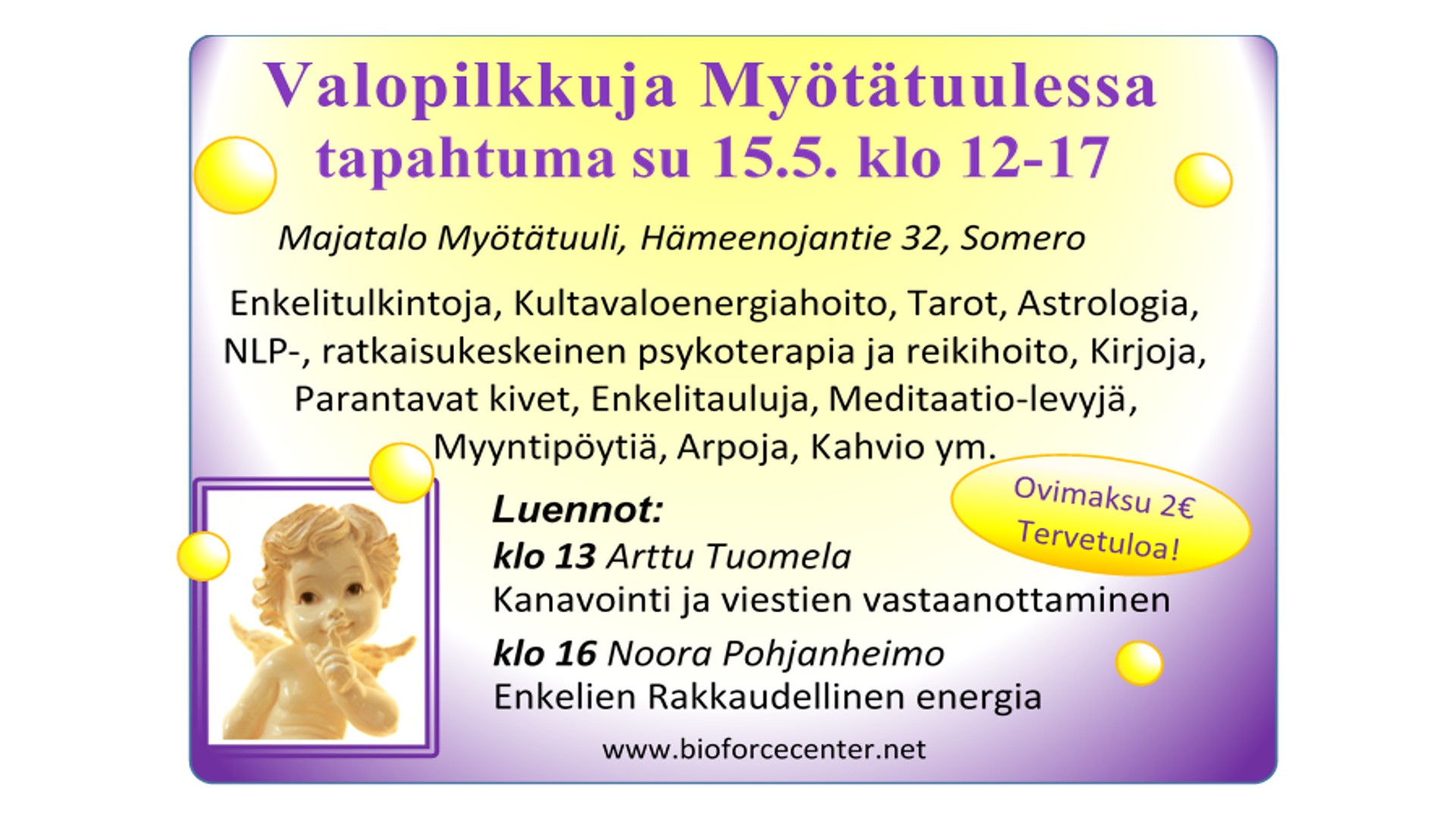 Enkeleitä, astrologiaa, hoitoja, myyntipöytiä, arpoja, kahvio ym.